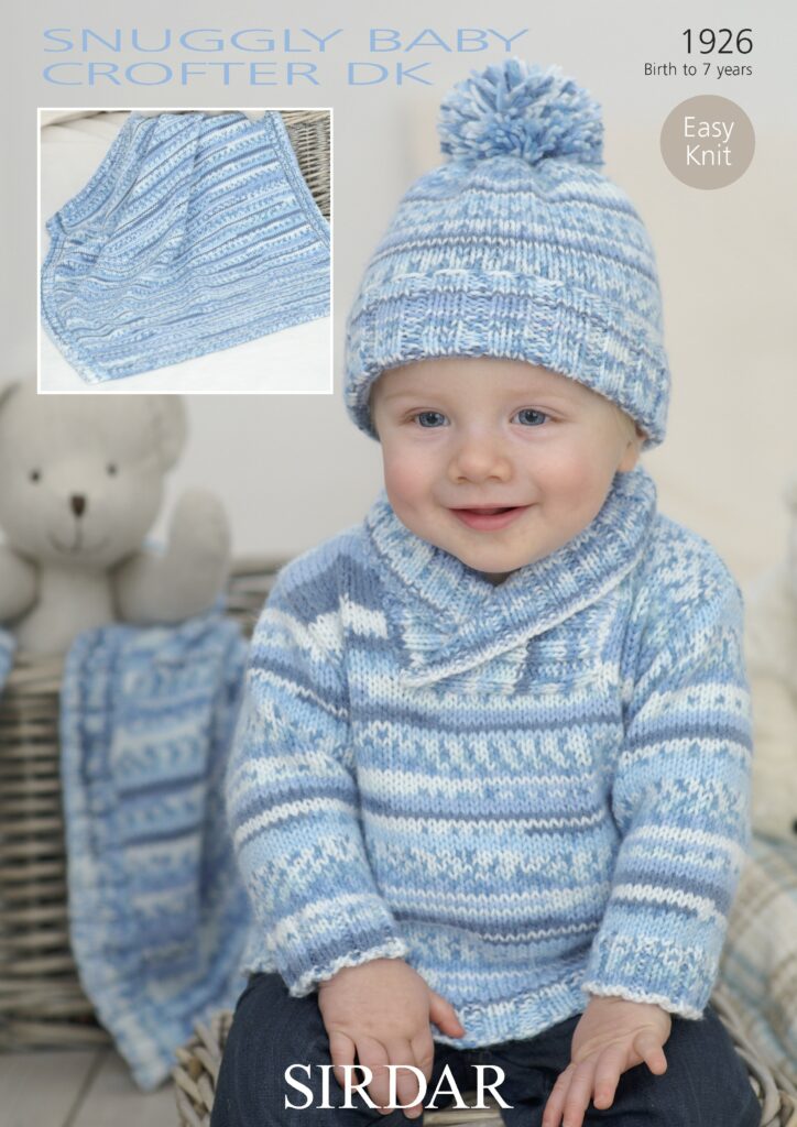 The Snuggly Baby Crofter DK pattern 1926 features a children’s beanie, sweater and baby blanket